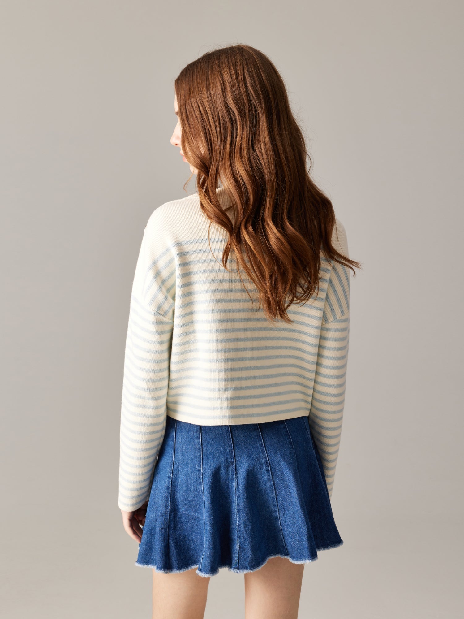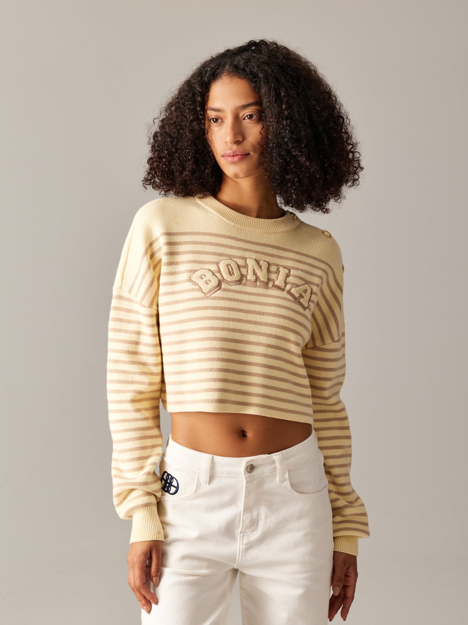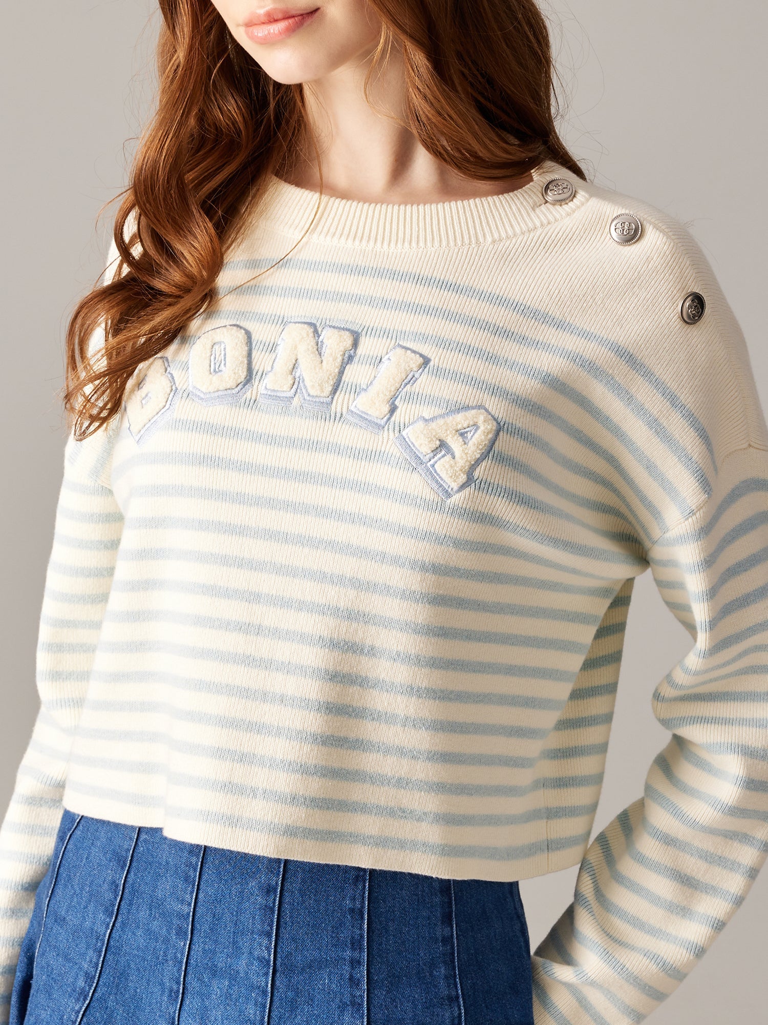 The Nova Top is a comfy sweater featuring knit stripes and the BONIA logo. With polished accents on the left, its La Luna hardware buttons add a touch of luxury to everyday looks.
